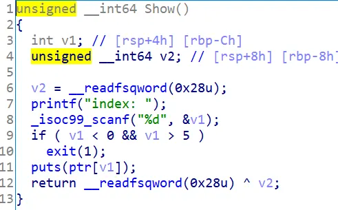 ptr의 인덱스를 선택하여 저장된 데이터를 확인하는 Show 함수이다. 9라인을 보면 입력한 인덱스가 0보다 작고, 5보다 크면 exit으로 빠지는데 0보다 작고 5보다 큰 수는 이세상에 없다.ㅋ