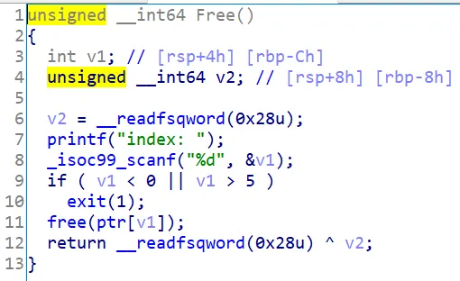 아까 ptr[6]에 차례대로 동적할당 받은 주소가 들어간다고 했다. 따라서 인덱스 0~5 까지 주소가 들어갈텐데, Free 함수에서 원하는 인덱스를 선택하여 free를 시킬수 있다.