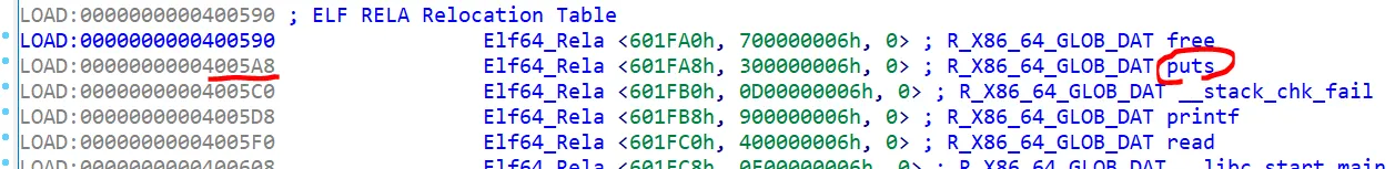 결국 아이다에서 LOAD 영역에 있는 elf64_Rela puts 주소를 puts의 인자로 주게되면, 해당 주소에는 puts_got의 주소가 들어가있게 되고 puts가 호출되면 puts_got에 들어있는 puts의 libc 주소를 leak할 수 있게 된다.