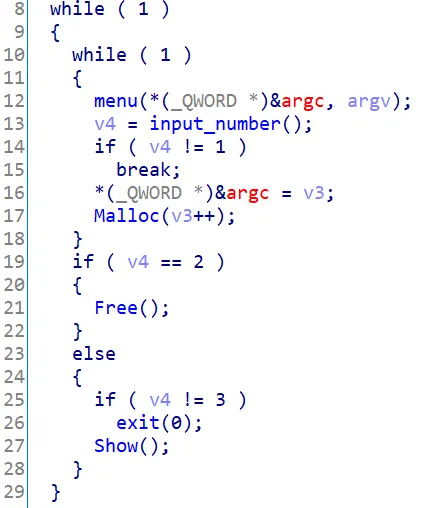 메인은 간단하다. 반복문을 돌면서 메뉴에 따른 동작이 진행된다. malloc 관련 함수는 Malloc에서 수행되고, free 관련 함수는 Free에서 수행된다. 마지막 Show 함수를 통해 출력물을 확인가능하다