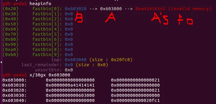 원래대로라면 fastbin list가 B→A 이렇게 되야하는데, 해당 mem영역에 데이터를 입력했기때문에 현재 A청크의 fd를 0xa41414141로 착각하여 리스트로 연결되어 있다.