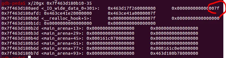 -35 주소를 부분 0x7f 라고 청크 사이즈로 둔갑가능한 값이 들어가 있다. 따라서 해당 malloc_hook-35 주소를 입력하면된다.