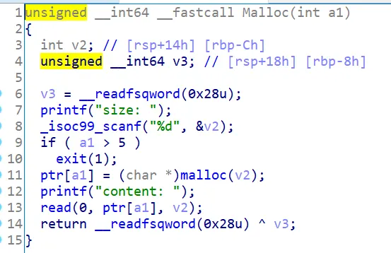 scanf로 원하는 사이즈를 입력받는다. 그리고 해당 사이즈에 맞게 malloc을 진행하고 해당 주소를 ptr 배열에 복사한다. ptr배열은 총 6바이트 크기로써 전역변수에 저장되어 있다. 따라서 최대 6개의 malloc을 호출가능하다.