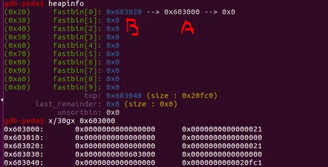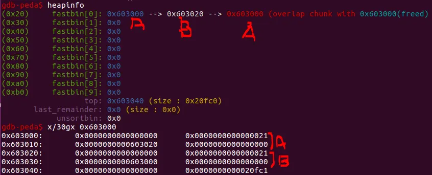 A가 다시 free 되어서 fastbin에 들어오게되었고, A의 fd가 B를 가리키고, B의 fd가 다시 A를 가리키는 비정상적인 상황이 되었다.