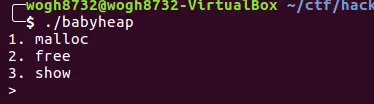 예상했던데로 힙 관련 프로그램이다. 1번 메뉴를 통해 원하는 사이즈를 입력받고 데이터를 삽입한다. 2번 메뉴는 free가 진행되고, 3번 메뉴를 통해 저장한 데이터의 확인이 가능하다.