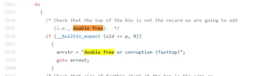 일반적으로 fastbin에 들어가는 청크들은 특별한 경우를 제외하고는 병합을 하지 않는다는 특징이 있다. 또한 A라는 청크를 free시키고 연속으로 다시 A를 free시키면 내부 체크로직에 의해서 강제종료가 된다. (아래 사진이 코드임)