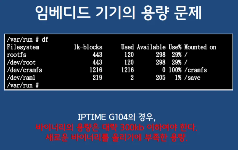 iptime의 경우 바이너리 용량은 대락 300kb 이기 때문에 새로운 바이너리를 올리기 부족하다.