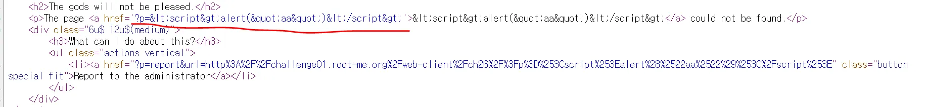 스크립트 태그를 넣으면 일단 안텨졌다. url 파라미터에 직접 넣은 값이 페이지에 그대로 나왔다. 링크가 걸려있는게 수상해서 해당 소스코드를 보았다.