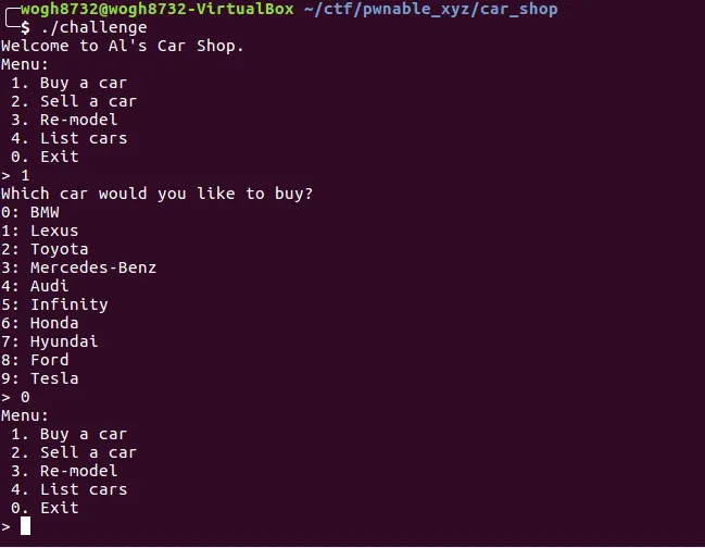1번 메뉴로 차를 구매할 수 있다. 차 종류는 10개이다. 2번 메뉴로 팔수도 있고 3번 메뉴로 모델명을 수정 가능하다. 마지막 4 번으로 구매했던 차들의 모델명들을 확인 가능하다