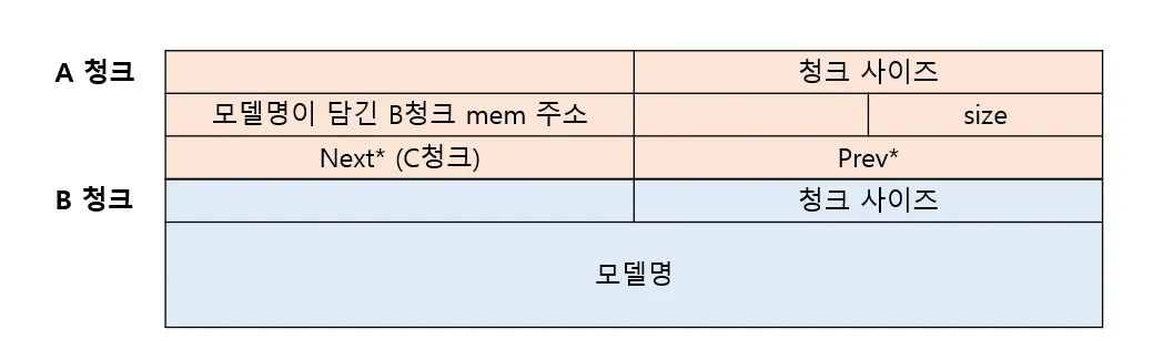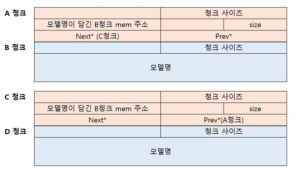 buy() 함수가 한번 호출될때 마다 위 사진처럼 청크가 생긴다. A청크에는 모델명이 담긴 청크의 주소와 사이즈가 들어간다. 그리고 next, prev 포인터가 있다. 즉 해당 포인터들은 이중연결리스트의 형태를 띈다. 만약 buy() 함수를 2번 호출한다면