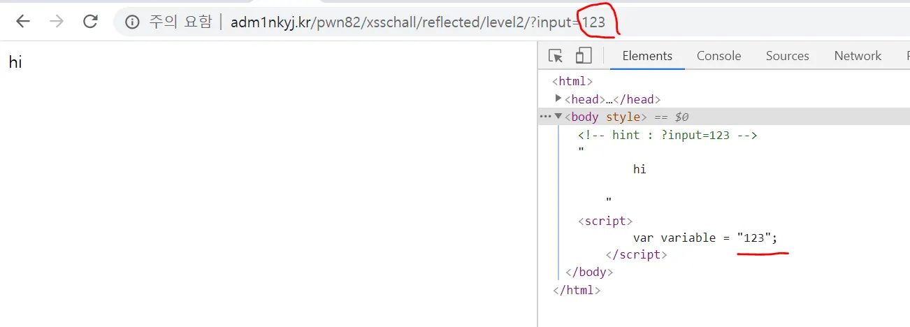 input 값에 파라미터가 입력한 들어간다. 소스코드를 보면, 파라미터가 스크립트 태그 안의 variable 변수에 담긴다.