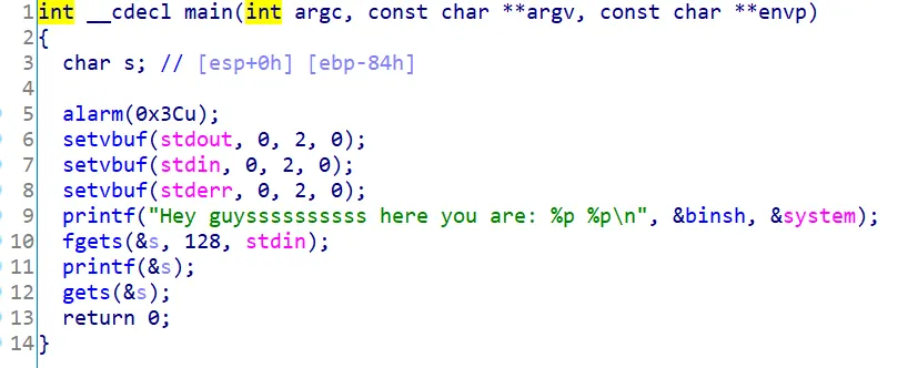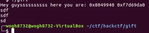출력되는 주소가 binsh의 주소와 system함수의 주소이다. 그리고 fgets로 128바이트 만큼 입력을 받고, 입력한 문자열을 출력해준 뒤, gets로 한번더 입력을 받게 된다. 여기서는 크기 제한이 없으므로 bof를 일으켜 ret를 변경하여 system함수를 실행시키면 될 것이다