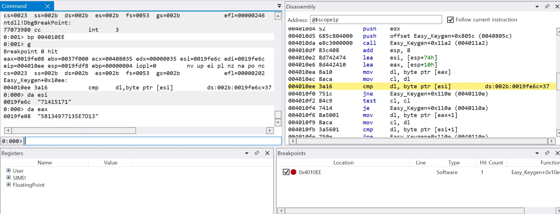 eax에는 입력한 시리얼키, esi에는 입력한 input의 연산된 결과가 저장된다. 왼쪽을 보면 각 레지스터에 담긴 아스키 값을 볼수 있는데,