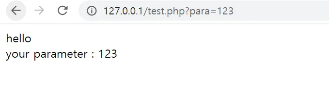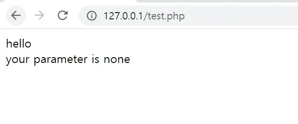 이런 페이지가 있다. (테스트로 만듬) test.php 페이에서는 파라미터로 들어온 값을 그대로 출력한다. 현재는 아무 파라미터가 없으니까 none을 출력한다.
