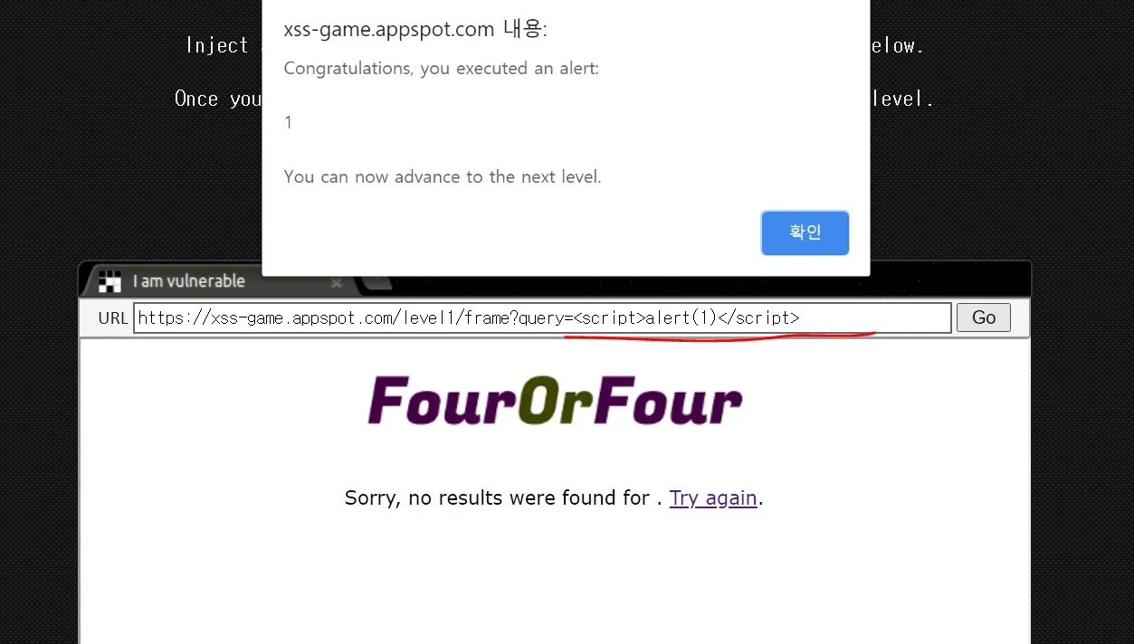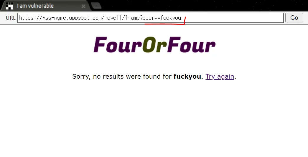 reflected xss도 매우 간단하다. 일반적으로 GET 요청인 경우, 파라미터가 URL에 붙여서 날라간다. 해당 URL 파라미터에 스크립트 태그를 넣게되고, 해당 url을 클릭했을때 스크립트가 실행되면 그걸 reflected xss라고 한다. 이해하기 쉽게 아까 그 워게임 사이트를 살펴보자.