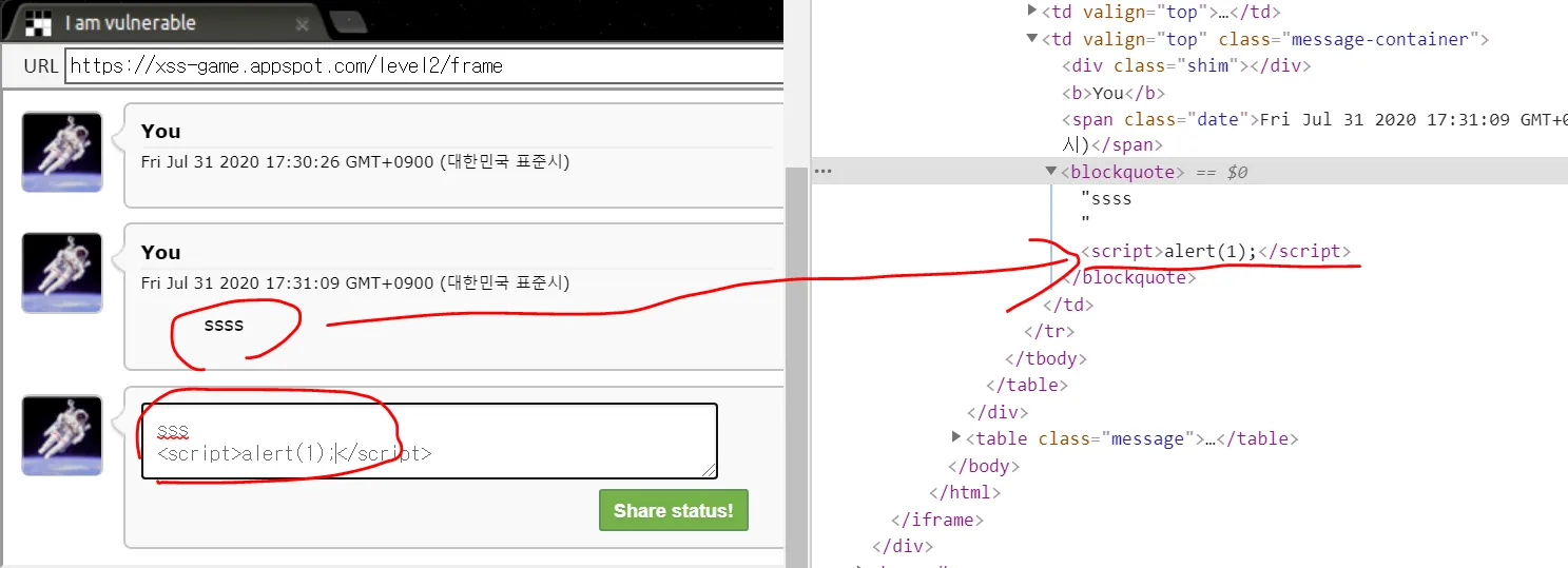 위 사진을 보면, 게시판 형태로 글을 게시할수 있다. 게시글에 일반적인 문자열 ssss을 입력하고 밑에 스크립트 태그를 입력했다. 그리고 렌더링된 코드를 보면, 입력한 스크립트 태그가 그대로 들어가 있는 것을 볼수있다.