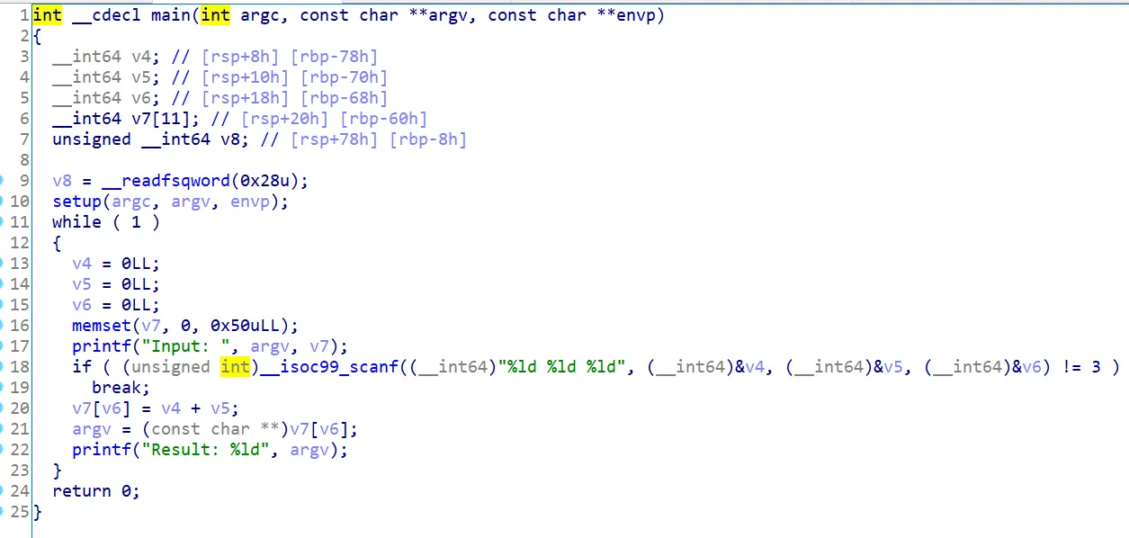 v4, v5, v6 int64 변수와, v7 배열을 하나 선언하고