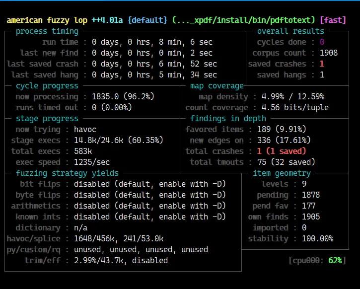 afl-fuzz -i $HOME/fuzzing_xpdf/pdf_examples/ -o $HOME/fuzzing_xpdf/out/ -s 123 -- $HOME/fuzzing_xpdf/install/bin/pdftotext @@ $HOME/fuzzing_xpdf/output