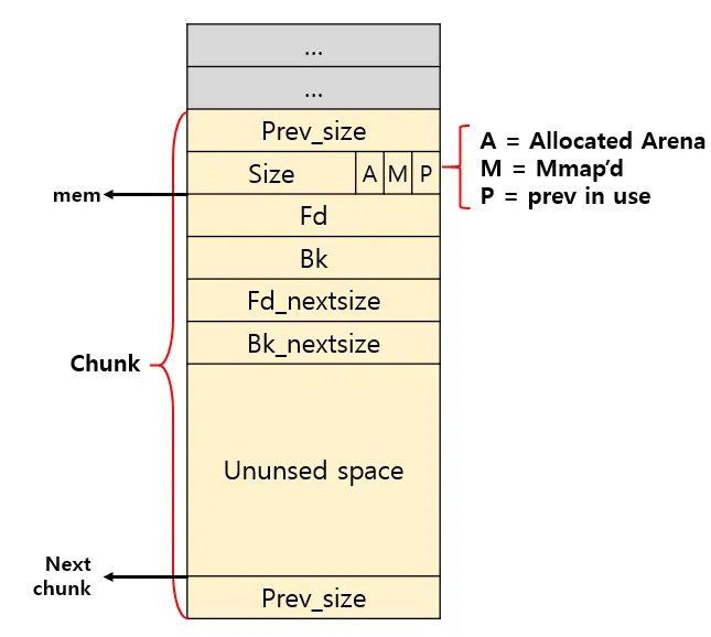 하나 알아둬야할 점은, malloc을 통해 할당된 청크는 prev_size, size, payload 이렇게 구성되어 있는데, 다음 다음 청크의 prev_size 필드도 현재 청크의 페이로드 필드로 사용된다. 따라서 실질적인 청크는 다음 청크의 prev_size까지 포함되며, free시에는 해당 영역은 현재 청크의 크기를 중복하여 저장하는 용도로 사용한다.