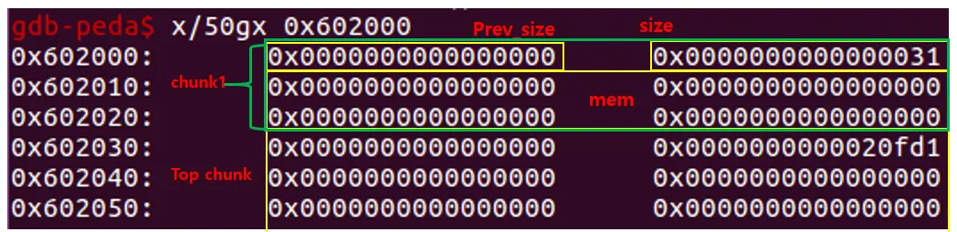 top chunk의 사이즈가 0x20fd1로 세팅되어 있다. 또한 이전 free된 청크가 없기 때문에 prev_size가 0으로 세팅되어 있다. 사용자에게 반환되는 주소는 mem 위치로 현재 0x602010 주소가 될 것이고, 여기에 실제 입력하는 데이터가 들어간다.
