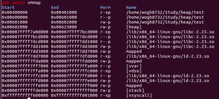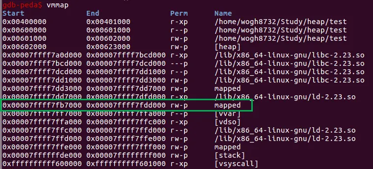 위 사진의 주소를 보면 기존에 할당받아왔던 0x6020.. 위치의 주소가 아니다. 또한 하위 2번째 bit가 1로 세팅되어 있기 때문에 mmap으로 할당받은 영역인것을 확인할 수 있다. 그럼 이 영역이 어느영역에 위치하는지 vmmap으로 확인해보자.