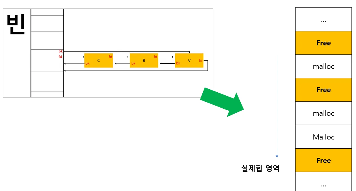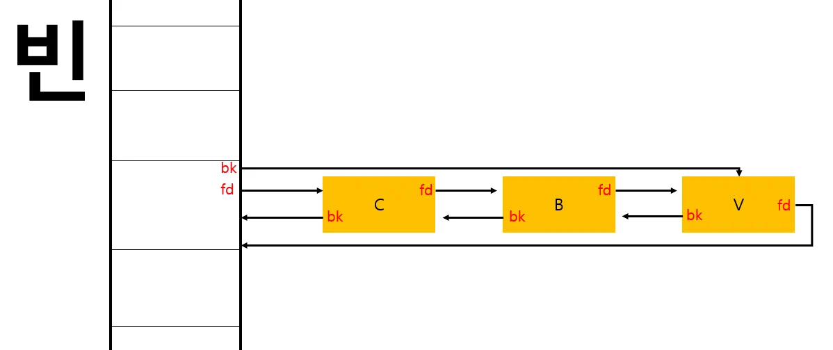 빈에 free된 청크들이 이중 연결 리스트로 연결되어 있다. fd, bk가 각각 이전 청크를 가리키기때문에 전체 free청크들을 순회하여 확인 가능하다. 여기서 헷갈리면 안되는 것이 있다. 빈에 등록된 free 청크들은 물리적으로 붙어있는 것이 아닌,
