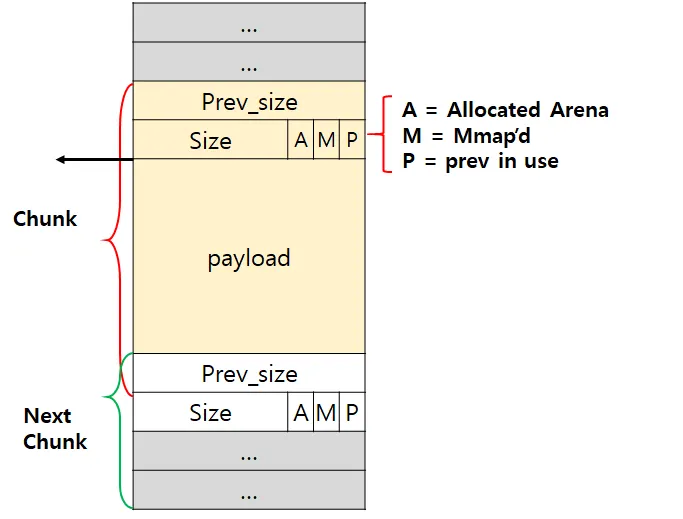 malloc() 함수가 호출됨으로서 할당받는 영역을 청크라고 부른다. 32bit에서는 해당 청크가 8byte 단위로 할당이 되고, 64bit에서는 16byte 단위로 할당된다. 일반적으로 malloc()을 호출하고 반환되는 주소를 이용하여 데이터를 입력하게 되는데, 사실 반환되는 주소는 청크의 시작부분이 아닌 페이로드의 주소이다.