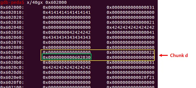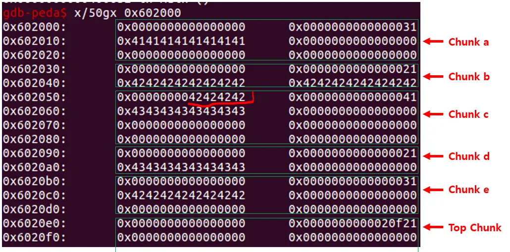 위 그림을 보면, 각 청크별로 초록색으로 구분을 지어놨다. 하지만 아까 청크설명부분에서 다음 청크의 prev_size도 현 청크의 페이로드부분으로 들어간다고 했으므로, 청크 b의 데이터영역이 청크 c의 prev_size 필드까지 들어간다는것(0x602050)을 확인 가능하다.