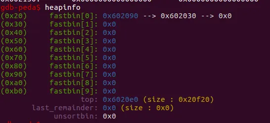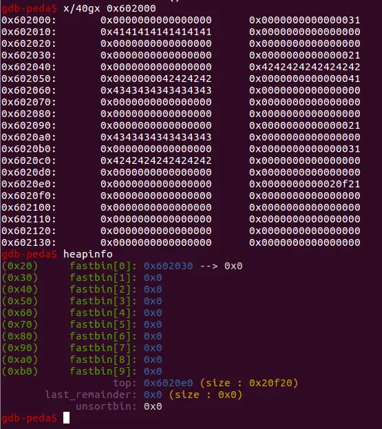 처음 탑 청크의 사이즈가 0x20f21에서 0x20f21로 변한것을 확인할 수 있다. 5개의 할당된 청크사이즈를 다 더해서 0x20f21에서 뺴면 0x20f21이 나온다.