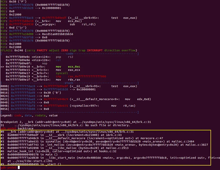 brk에 bp가 정상적으로 걸린것을 확인 할 수 있다. 또한 backtrace로 호출 과정을 살펴보면, 위 알고리즘의 sysmalloc을 호출하고 sbrk→brk를 호출하는 것을 확인 가능하다. malloc 호출이 종료되면 다음과 같다.