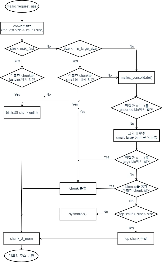 만약 현재 top 청크 크기보다 더 큰 사이즈를 요청하는 경우, main_arena의 경우 sbrk로 top 청크의 크기를 확장시키고, thread_arena의 경우는 mmap으로 새롭게 메모리를 받아온다.