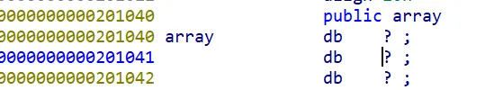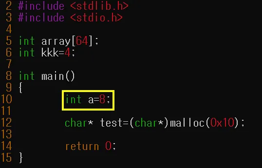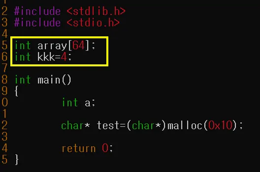 일반적으로 전역변수로 할당된 데이터는 컴파일 시점에서 사이즈가 결정된다. 아래 그림을 보면 전역변수로 64크기의 배열과 int형 변수 kkk가 선언되어있다.