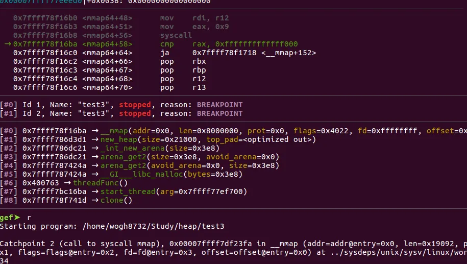 thread2의 힙영역(0x00007ffff0000000 ~ 0x00007ffff4000000)이 생성된 것을 확인 할 수 있다. 해당 영역은 brk를 사용해서 할당하는 main_thread와는 달리 mmap을 사용하여 힙 메로리가 생성된다. threadFunc 함수에서 malloc이 호출되는 과정중에 mmap이 호출된다. 아래 그림이 해당 mmap 호출 부분이다.