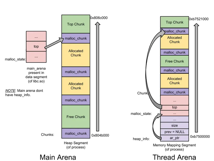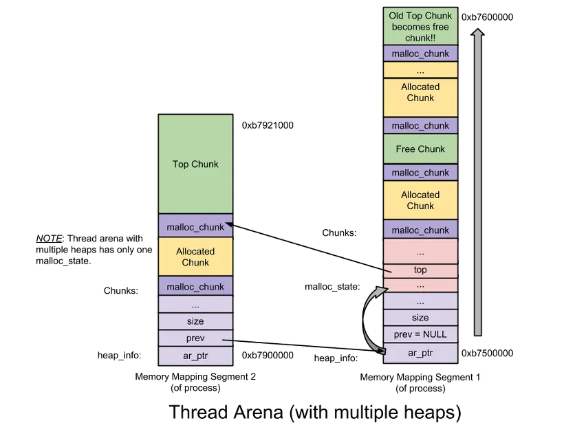main_arena는 여러개의 힙을 가질수 없다. main_arena의 공간이 부족한 경우, sbrk 힙 영역은 메모리가 매핑된 영역까지 확장된다. 어쨋든 이런 힙 영역은 어떤 arena가 관리하고 있는지, 힙 영역의 크기가 어느정도인지, 이전에 사용하던 힙 영역의 정보가 어디에 있는지를 저장할 필요가 있다.
