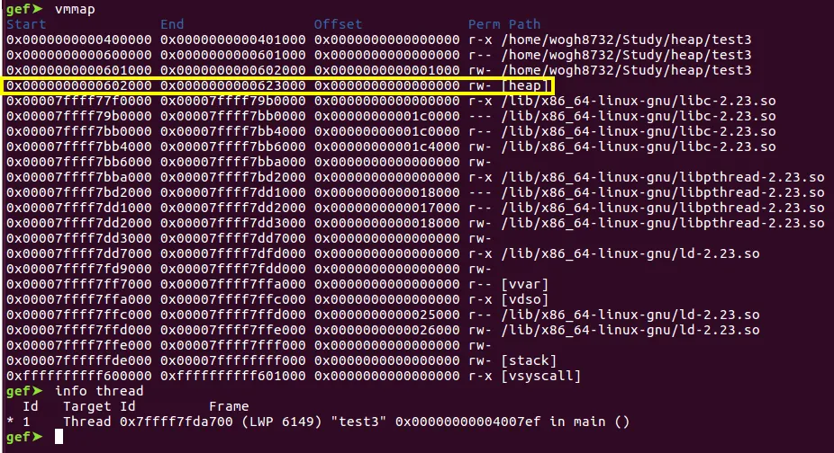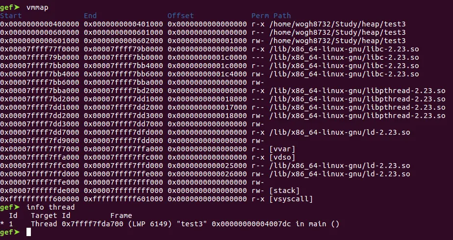 현재 main() 에서 malloc이 호출되기 전 메모리 상태이다. pthread_create가 진행되지 않았으므로 메인 쓰레드 밖에 없는 것을 확인 할 수 있다. 또한 힙영역이 아직 없는 것을 확인할 수 있다