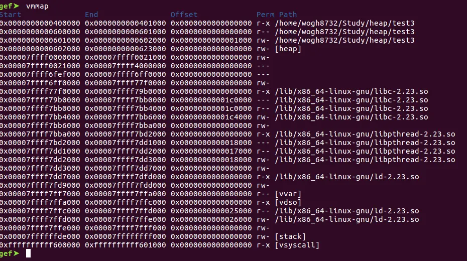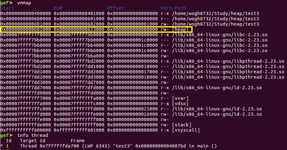 malloc이 호출되고, free되기 전 상황이다. 힙 영역이 0x602000 ~ 0x623000 에 생성된 것을 확인할 수 있다. 이는 brk syscall을 사용하여 program break 위치를 증가시킴으로 확장된 영역이다.( 데이터 세그먼트 영역을 늘렸다는 뜻)