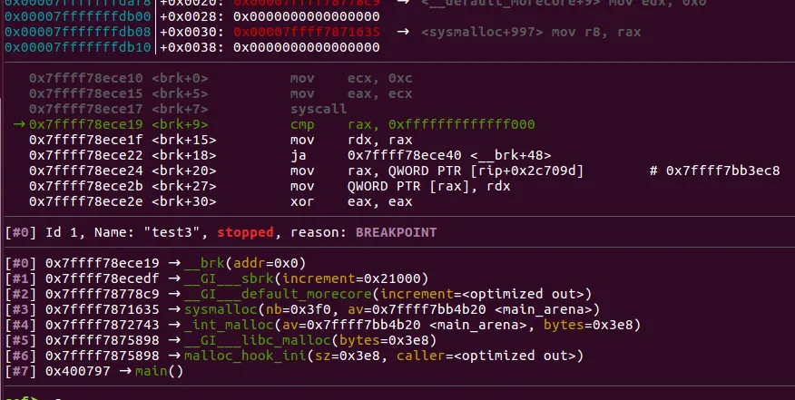 "gef> catch syscall brk " 명령어를 이용하여 brk에 bp를 걸고 malloc 함수가 호출되면 malloc이 실행되는 과정에서 brk syscall이 호출되는 것을 아래 그림에서 확인 할 수 있다