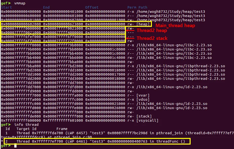 thread2에서 free 호출 이후 역시, 바로 메모리를 반환하지 않는다는 것을 확인 할 수 있다. 이 역시 아까처럼 해제한 영역은 thread_arena의 bin에 해제된 블럭을 추가하고 gblic malloc에 반환한다.