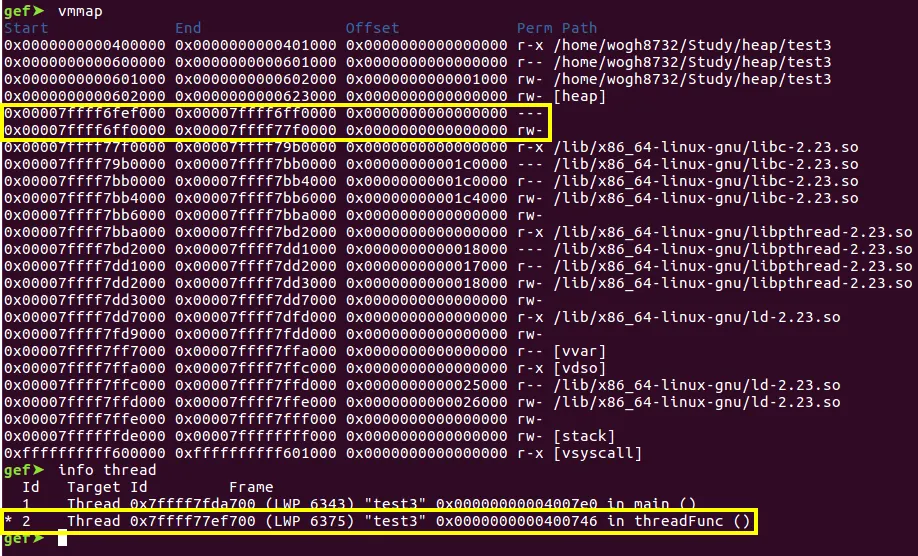 0x00007ffff6fef000 ~ 0x00007ffff77f0000 영역이 바로 thread2의 스택 영역이다