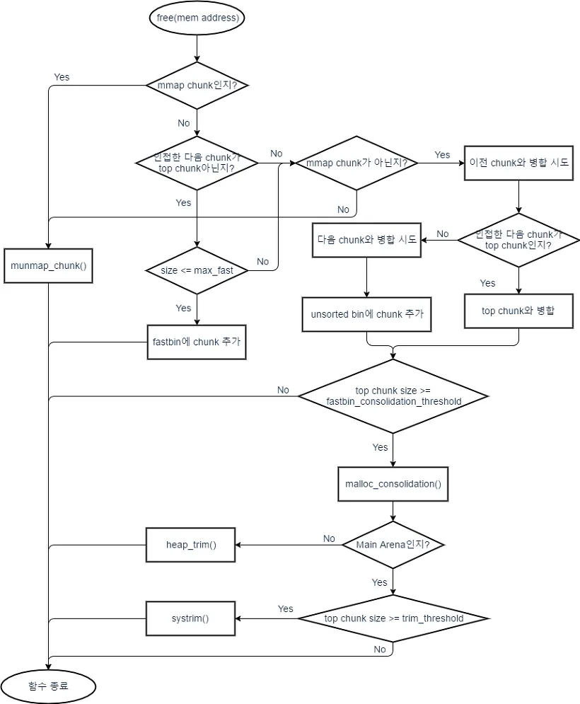 chunk를 해제한 후, 크기에 맞는 bin을 찾아 저장하고 top chunk와 병합을 할 수 있다면 병합 수행