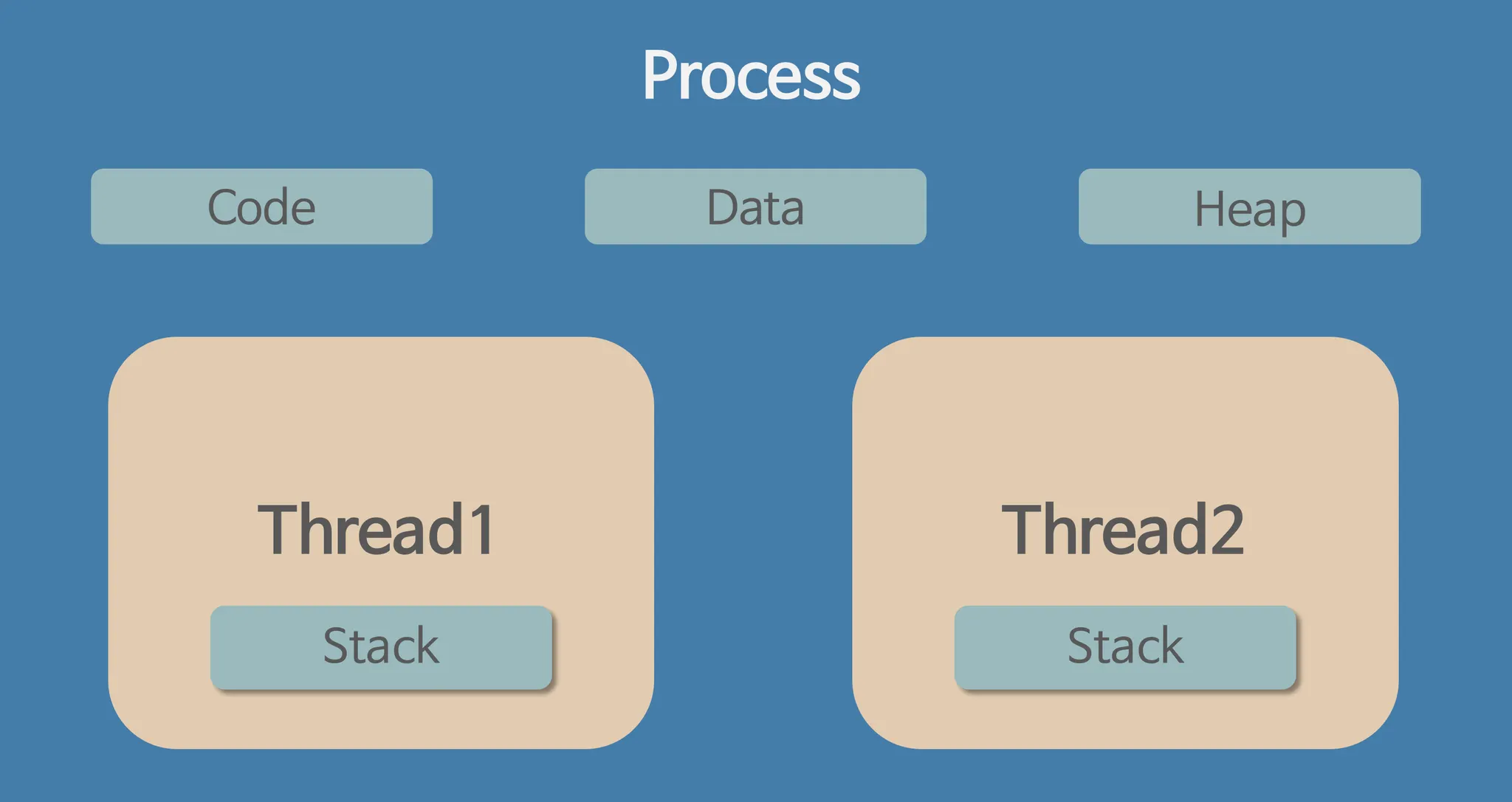 스레드는 프로세스 내에서 각각 스택만 따로 할당받고, Code, Data, Heap 영역은 공유한다