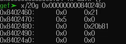 위 사진이 실제 힙영역이다. 13라인의 5가 0x840247에 들어가 있는 것을 볼 수 있다. 바로 이 주소를 malloc이 수행되고 반환해주는 것이다.