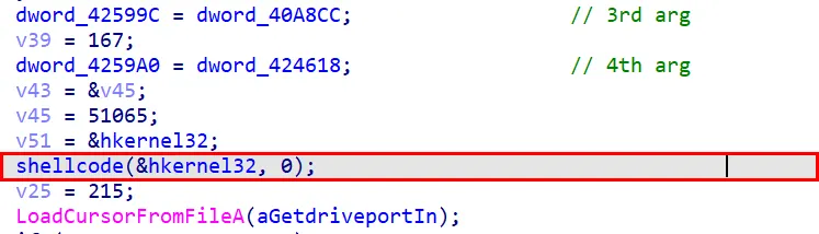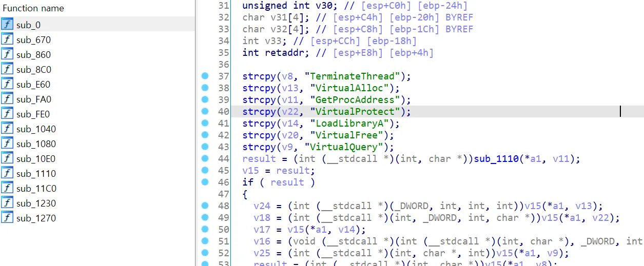 덤프뜬 쉘코드를 디컴파일러로 확인해보면 이전과는 다르게 많은 함수들이 나오는걸 볼 수 있다. 해당 쉘코드가 실제 악성행위를 하는 바이너리이다. 이렇게 덤프를 뜬 쉘코드가 실제 악성행위를 한다는것을 확인했으므로 해당 쉘코드가 어떻게 호출되는지를 이어서 살펴보자.