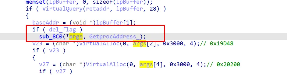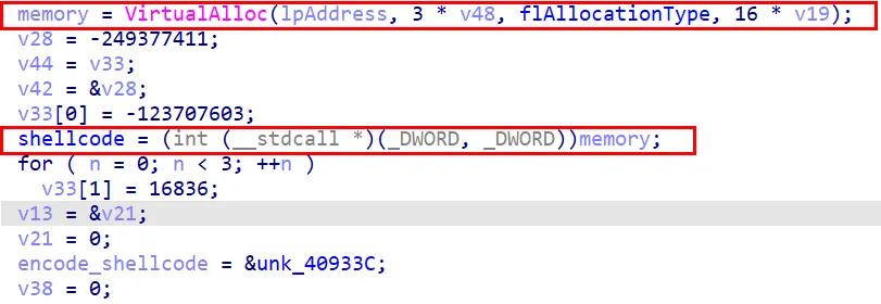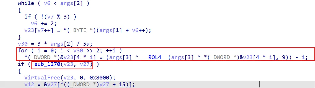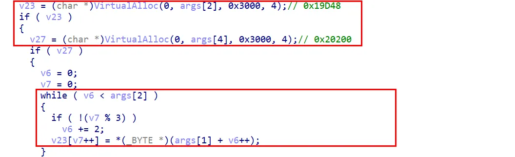 메모리를 할당받은 다음, args[2] 사이즈인 0x19D48만큼 루프를 돌면서 할당받은 v27배열에 특정연산을 거친 값을 넣는다. args[1]은 초기 sample.exe에서 디코딩하기 전 인코딩된 쉘코드 부분이다. 루프가 끝나면 v27에는 새롭게 연산된 쉘코드가 쌓일것이다