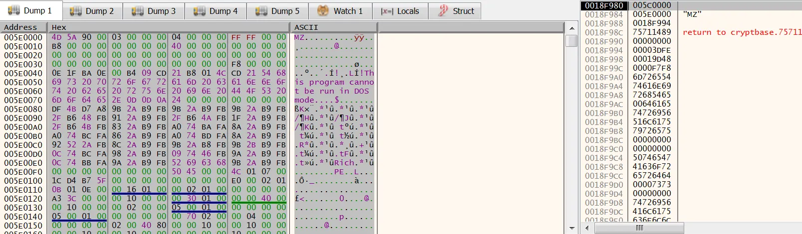 0x5E0000+0x20200 만큼의 영역에 압축해제된 쉘코드가 담기므로 위 영역을 덤프떠보자