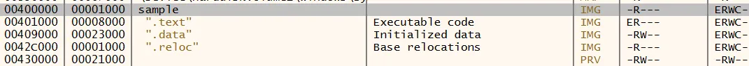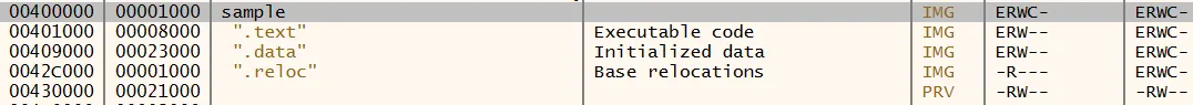 baseAddr은 현재 sample 의 ImageBase 주소를 가리키고 있다. VitualProtect 함수를 통해 sample 바이너리의 메모리 권한을 EWX로 변경한다.
