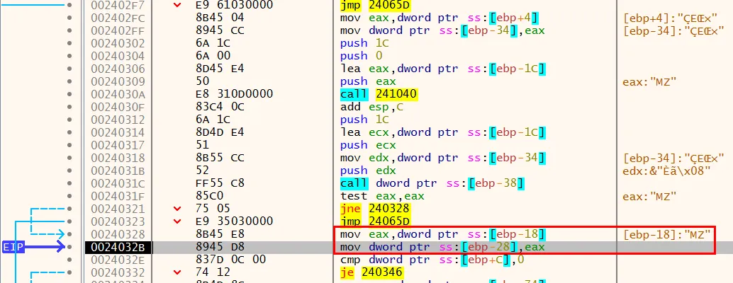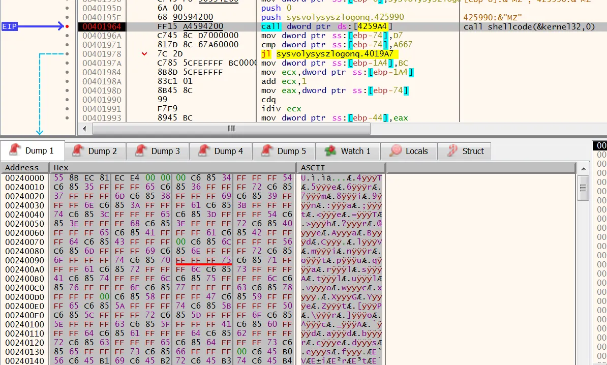 0x240000 영역의 주소가 VirtualAlloc으로 할당받은 영역이고 해당 영역에 0x564*4 만큼의 디코딩된 쉘코드가 써졌다. 따라서 0x240000 ~ 0x240000+0x564*4 만큼을 덤프하면 shellcode를 추출할 수 있다.