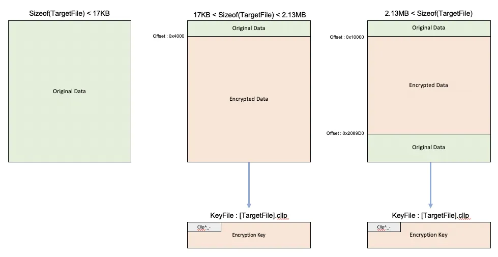 파일 사이즈가 비교적 작은 경우도 비슷하다. 차이점은 메모리 맵 파일을 이용하지 않고 일반적으로 파일을 생성하여 그곳에 암호화된 파일을 저장한다. 파일 오프셋은 0x4000 부터 EOF 까지이다.