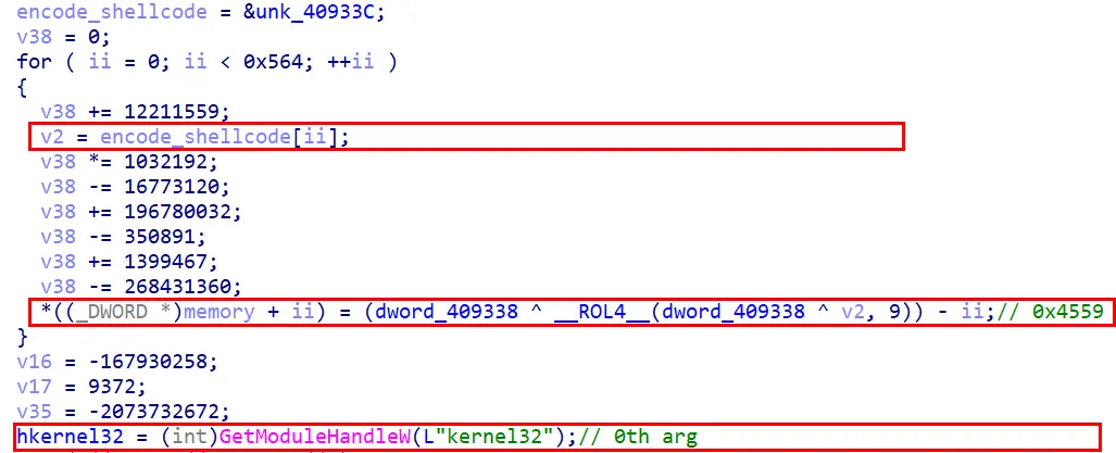 이렇게 루프를 총 0x564만큼 돌면서 4바이트씩 인코드되어있던 쉘코드를 디코딩후 저장한다. 그다음 GetModuleHandleW() 함수를 호출하여 kernel32 dll의 핸들을 받아온다.